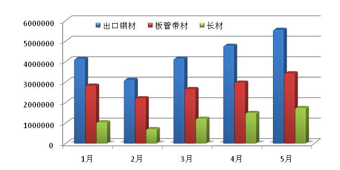 尽管钢协在第一时间就加征关税的传闻进行了澄清,但5月份的钢材出口数量还是轻松突破了550万吨。估计6月份出口数量至少不会低于5月。据海关的统计数字,今年前5个月,国内累计出口钢材2172万吨,出口钢坯11万吨,分别同比下降了20.8%和96.9%。从环比的角度分析,今年前5个月钢材出口呈现为逐月放大的趋势。国际市场价格高位运行显然对国内市场的钢材出口形成了拉动因素,因此,蓝鲸钢工作室认为下半年国际钢材价格走势对国内钢材出口形势的影响巨大。 一、今年前5个月,国内钢材进出口双双同比下降,但环比连续数月呈上升态势。同时,出口结构进一步向板管带材倾斜,这一趋势在今年下半年不会改变。 1、今年前5个月,国内累计进口钢材702万吨,累计出口钢材2172万吨,净进口钢材1470万吨,同比降低了27.0%;累计进口钢坯8万吨,累计出口钢坯112万吨,净出口钢坯3万吨,同比降低了99.1%。蓝鲸钢工作室认为即使是最为保守的估计,在4-5月份的出口环比上升的局面下,对6月份的出口形势都会作出持续上升的预计。 ![]() 2、从出口结构分析,板管带材持续增加,长材出口比例呈降低的趋势。今年前5个月,长材出口比重为28.5%,比上年同期降低了9.4个百分点,板管带材出口量为1409万吨,出口比重为64.9%,比上年同期提高了7.5个百分点;长材进口比重为8.0%,同比下降了0.6个百分点,板管材比重为89.7%,同比提高了0.9个百分点。