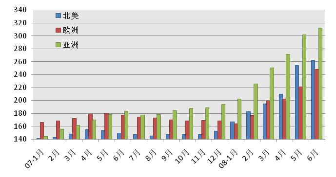 二、国际市场的拉动因素强劲,美国、欧洲和亚洲地区的钢材价格迅猛上涨,拉动国内钢材价格持续上升。 1、从CRU的国际价格指数看,尽管看起来在进入08年以后,三个主要市场的价格指数增长达到了空前的幅度,但是从价格指数高度的变化情况看,亚洲指数越来越成为价格涨幅的领跑者了。因为从去年的7月份起,欧洲就已经被亚洲代替成为第二棒。但进入08年以来,欧洲第二棒的位置也不能保证了,北美地区和亚洲地区远远地把欧洲市场甩在后面。 ![]() 从价格指数的同比情况看,北美地区钢材价格指数今年以来上涨了71.5%,是全球价格上升速度最快的地区;其次是亚洲地区,价格上升了60.9%;欧洲地区也有不俗的涨幅,累计上涨了47.2%,但这个涨幅分别比北美和亚洲低24.3个百分点和13.7个百分点。