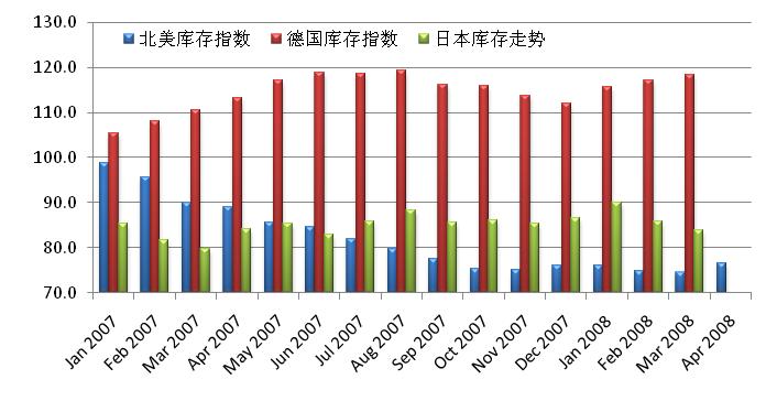 2、北美地区价格疯狂上涨当然不是没有原因的,需求增长和资源的相对短缺是价格上涨的主要动力,由于北美地区的钢材进口长达十四个月持续降低,使得库存指数处于一个非常低的水平,即使在今年4月份有所抬头,但仍处于非常低的水平。 ![]() 欧洲的德国以及亚洲的日本情况较为复杂,日本进入08年以来,库存指数呈现降低的趋势,但基本上是周期性的波动。而德国库存水平呈持续上升的态势。日本和德国价格保持上涨很大程度上应归于原料价格大幅度上涨带来的成本上升,美国当然也存在这样的问题,但库存水平偏低对价格的强劲上升起了重要的作用。此外高昂的海运费也阻挡了钢材全球范围内的流动,也是造成钢材资源局部紧张的因素。 预计下半年的全球钢材价格将继续高位运行,从原料成本以及运费成本考虑以及人民币持续升值的角度看,国内钢材价格也将保持一定的韧度,出口数量继续保持环比增长也应该不会令人感到意外,当然这是在关税不做调整的情况下。(【蓝鲸钢工作室】) |