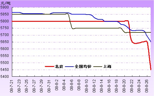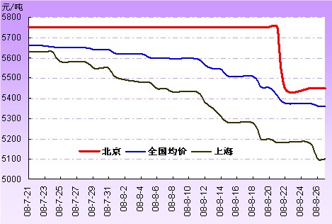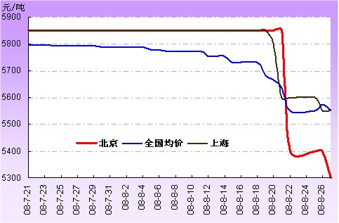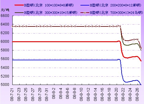 由上图可以看出,8月初型钢市场虽然已经进入积极性需求淡季,但是受成本价格处于高位的支撑,型钢市场基本上以稳中趋弱为主,价格下跌幅度有限。随着原材料市场的不断松动,整个钢材市场跌声一片,型钢市场也不例外,在钢厂价格不断下调、市场需求日益萎缩的情况下,型钢市场也出现了大幅下跌的现象。北京市场受奥运的影响,与其他城市相比成交量更少,但是在周边市场价格不断下行的影响下,本地商家也随之下调出货报价。但是由于终端需求清淡,北京市场型钢价格的调整对市场并没有明显的影响。 市场反馈,由于市场需求清淡,国内部分城市报价较为混乱,相同品种同种规格的报价有的甚至相差100元,究其原因,主要是成交不佳、各商家手中资源量不同所致。